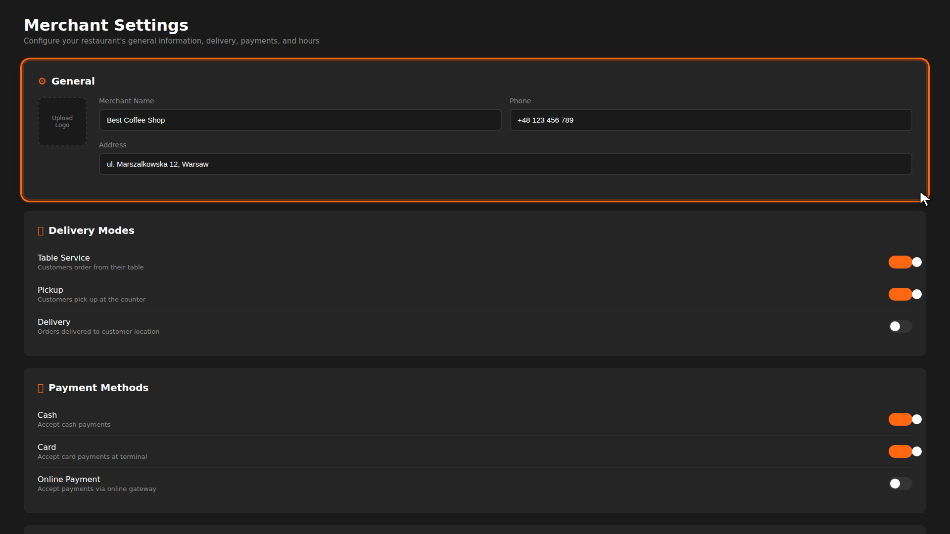 The Settings page is where you configure the fundamentals of your restaurant on OtoPoint — your name and logo, which delivery modes customers can choose, which payment methods you accept, and when you are open. Getting these right ensures customers see accurate information and can only select options you actually support.