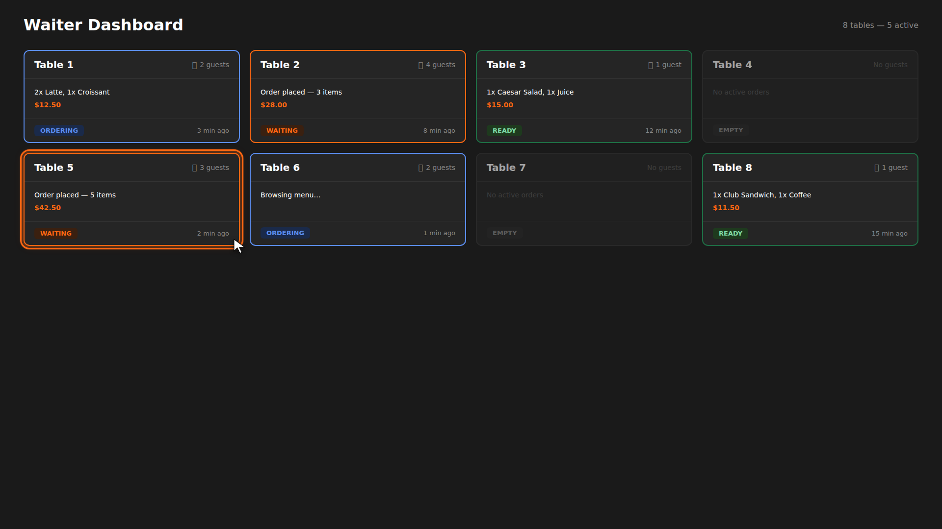 The waiter dashboard gives you a bird's-eye view of every table in your venue. Each table appears as a card showing who is seated, what they ordered, and what needs your attention. Here is how to use it day-to-day.