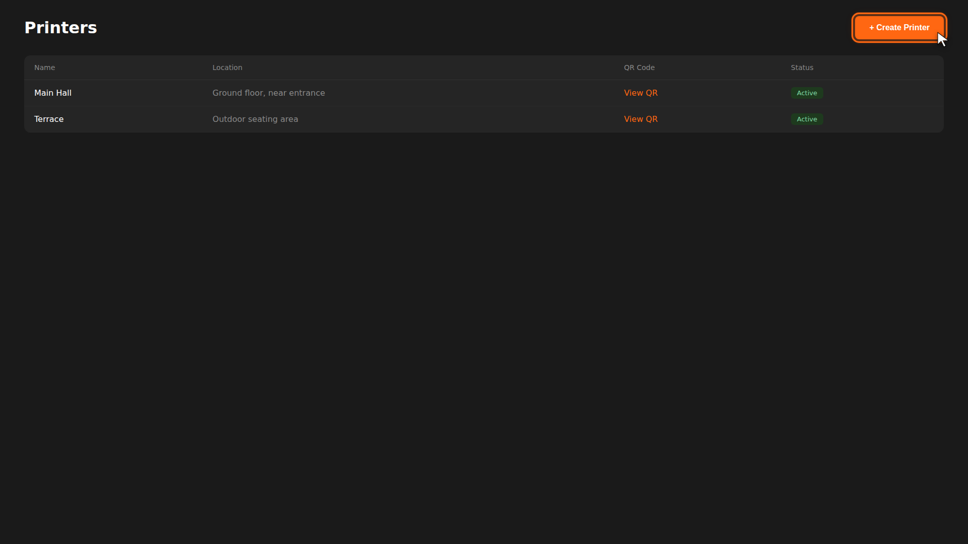 In OtoPoint, a printer is a service point — a physical location (table area, counter, terrace) where customers scan a QR code to open the menu and start ordering. Each printer gets its own unique QR code that you print and place at that location.